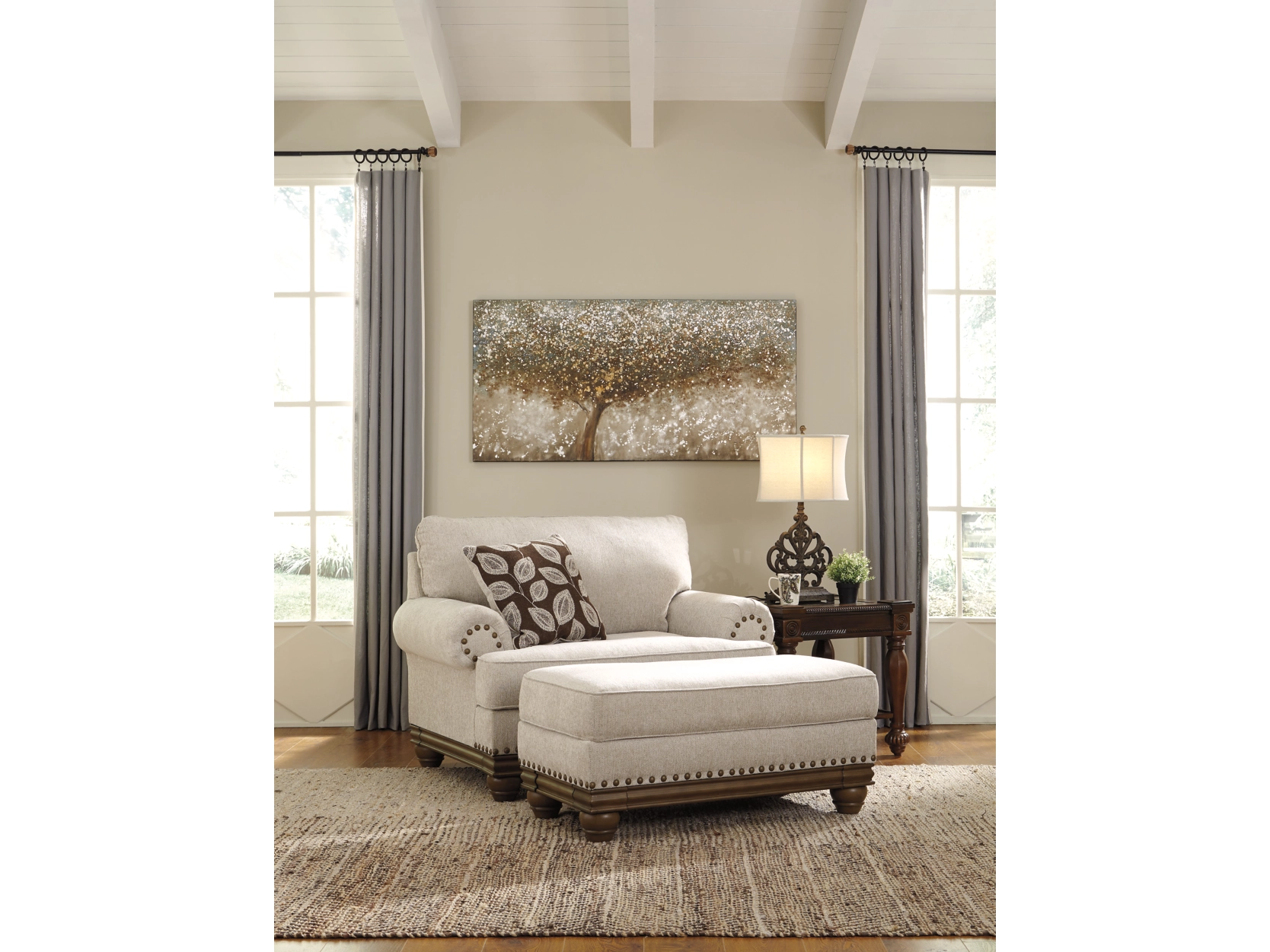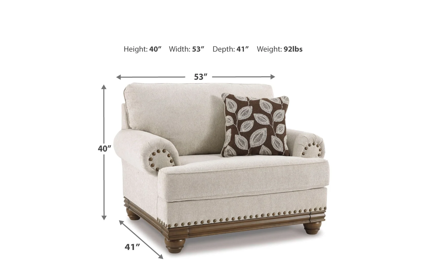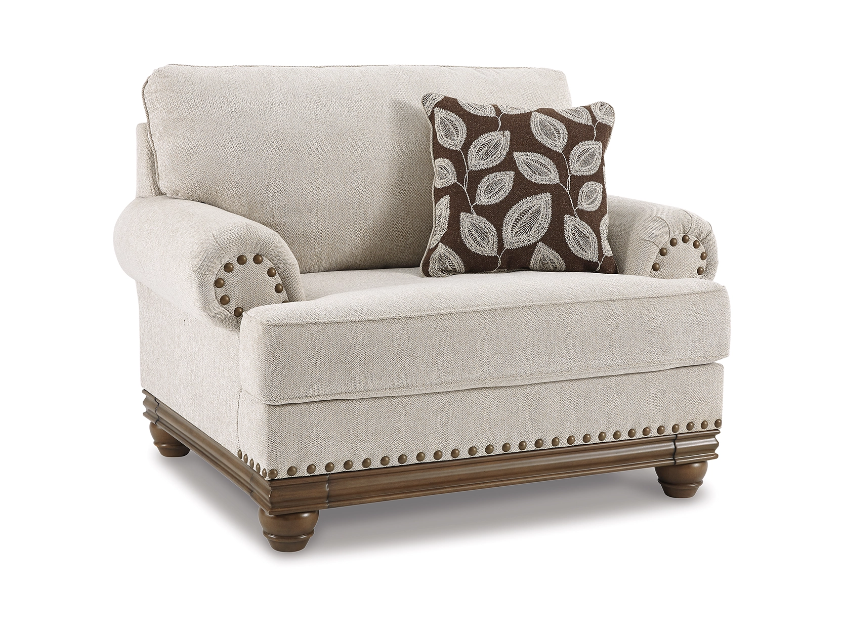 True classic character comes to life in the Harleson oversized chair with room for two to sit. Set back pleated rolled arms and warm brown exposed frame with bun feet are beautifully traditional. Lovely detailing carries itself through the herringbone weave in the soft upholstery. Seat cushion reverses to maintain durable comfort. Vintage-inspired jumbo nailhead trim graces the design. Botanical pillow in dark brown is a timeless touch.