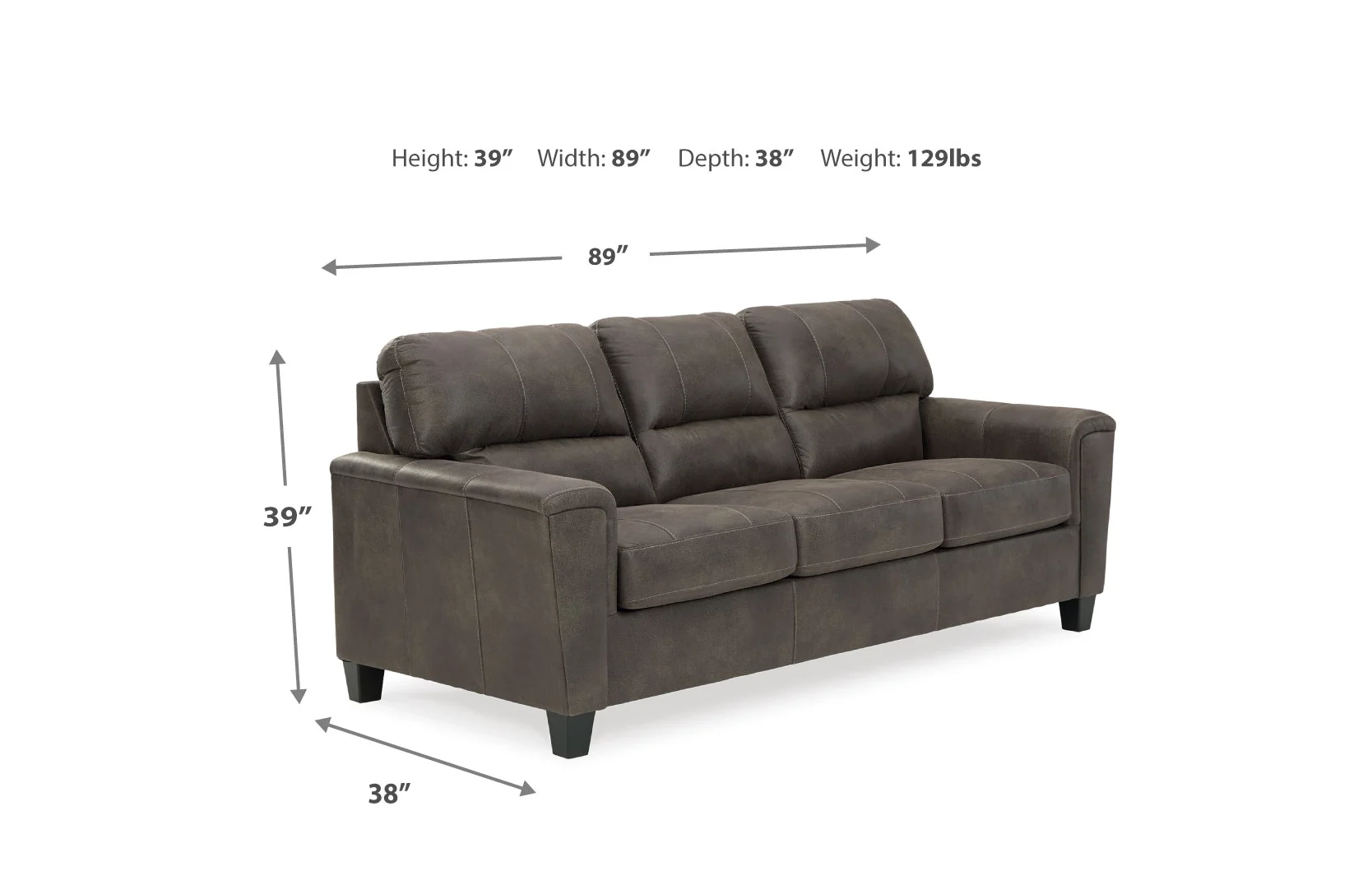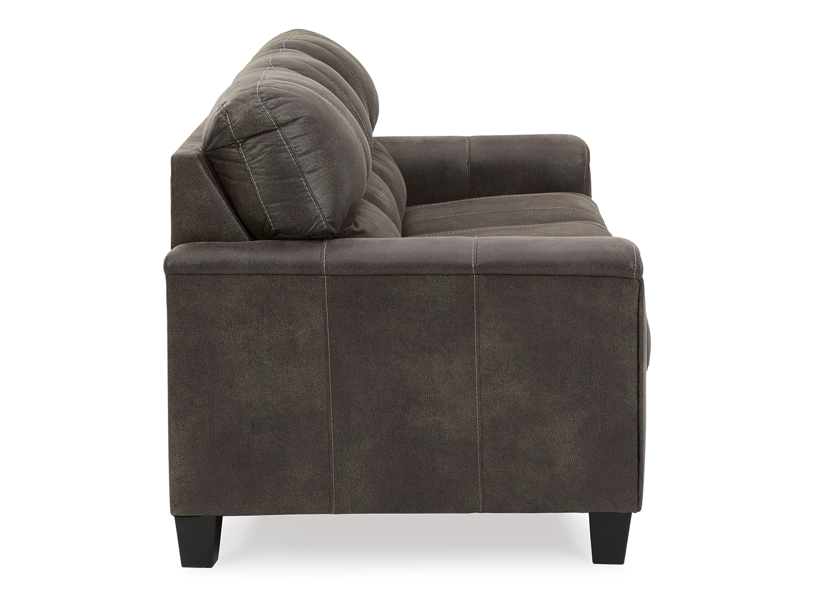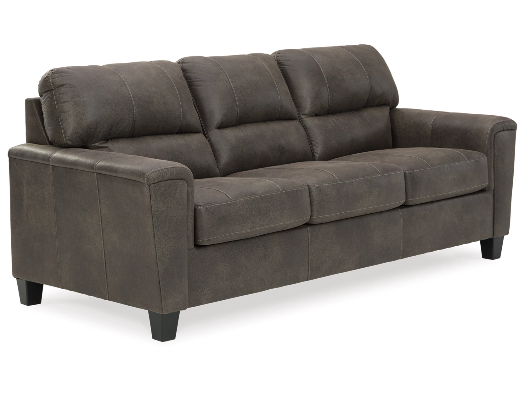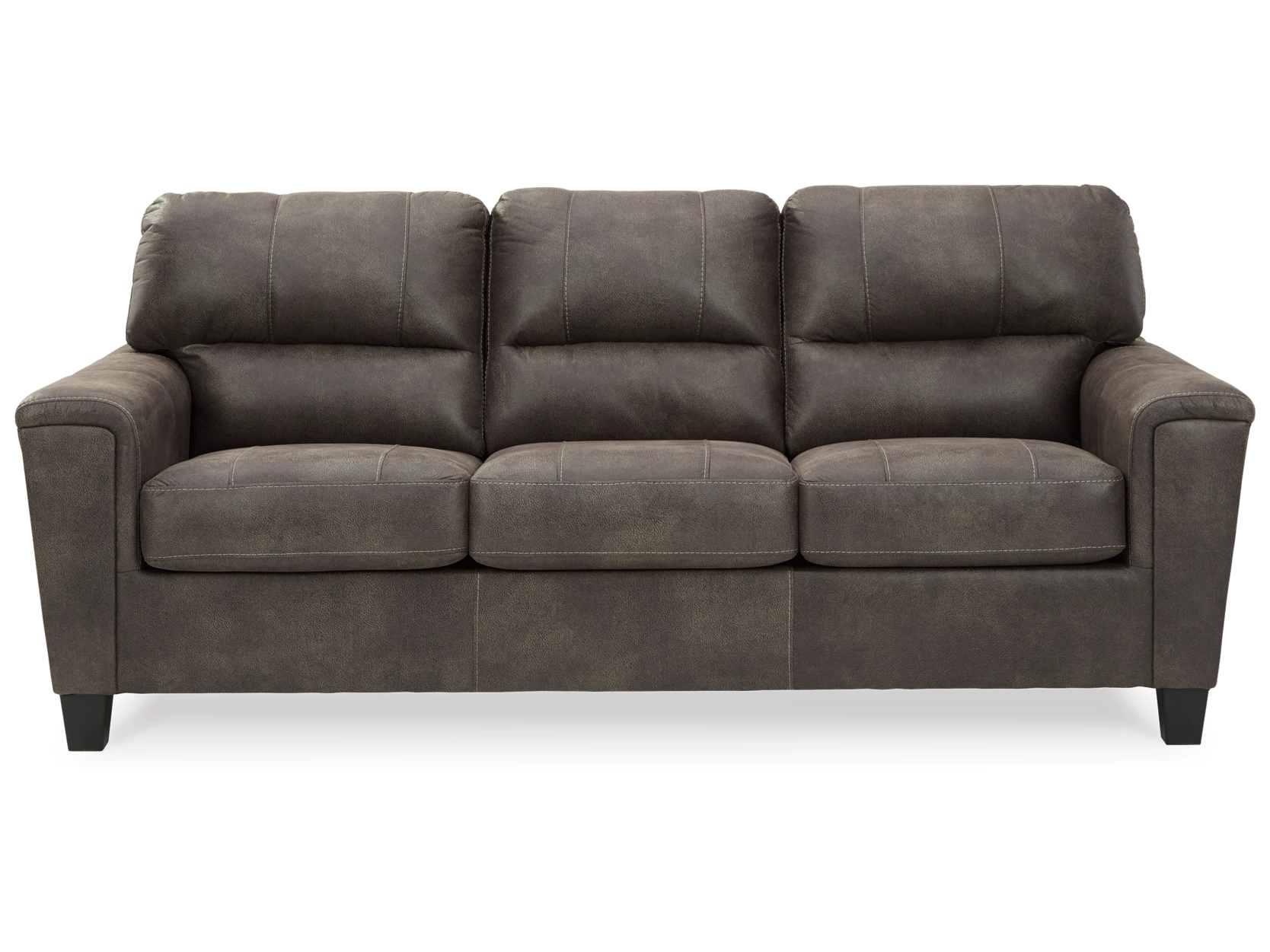 If you love the cool look of leather but long for the warm feel of fabric, you can take comfort in the Navi sofa. Wrapped in a fabulous faux leather with a weathered hue and hint of pebbly texture to resemble the real deal, this decidedly modern sofa proves less is more. Elements include angled side profiling and track armrests wrapped with a layer of pillowy softness for that little something extra. Prominent jumbo stitching and clean-lined divided back styling lend fashion-forward flair.